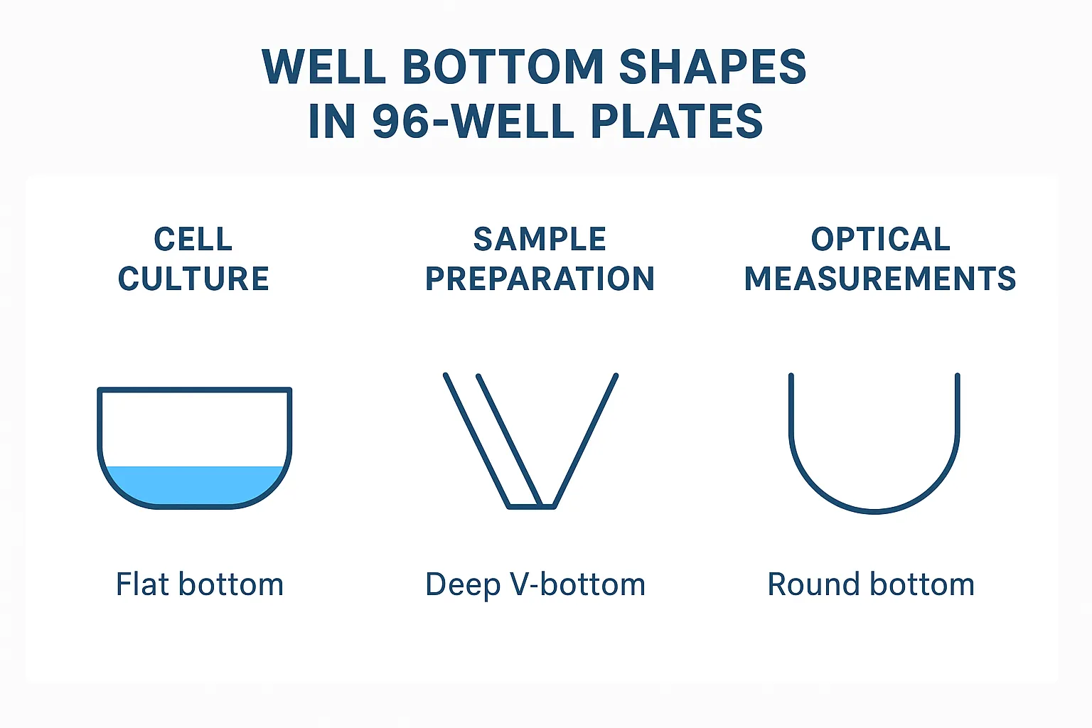 • Well bottom shape—flat (F-bottom), round (U-bottom), or V-bottom—directly impacts cell culture success and sample recovery efficiency​