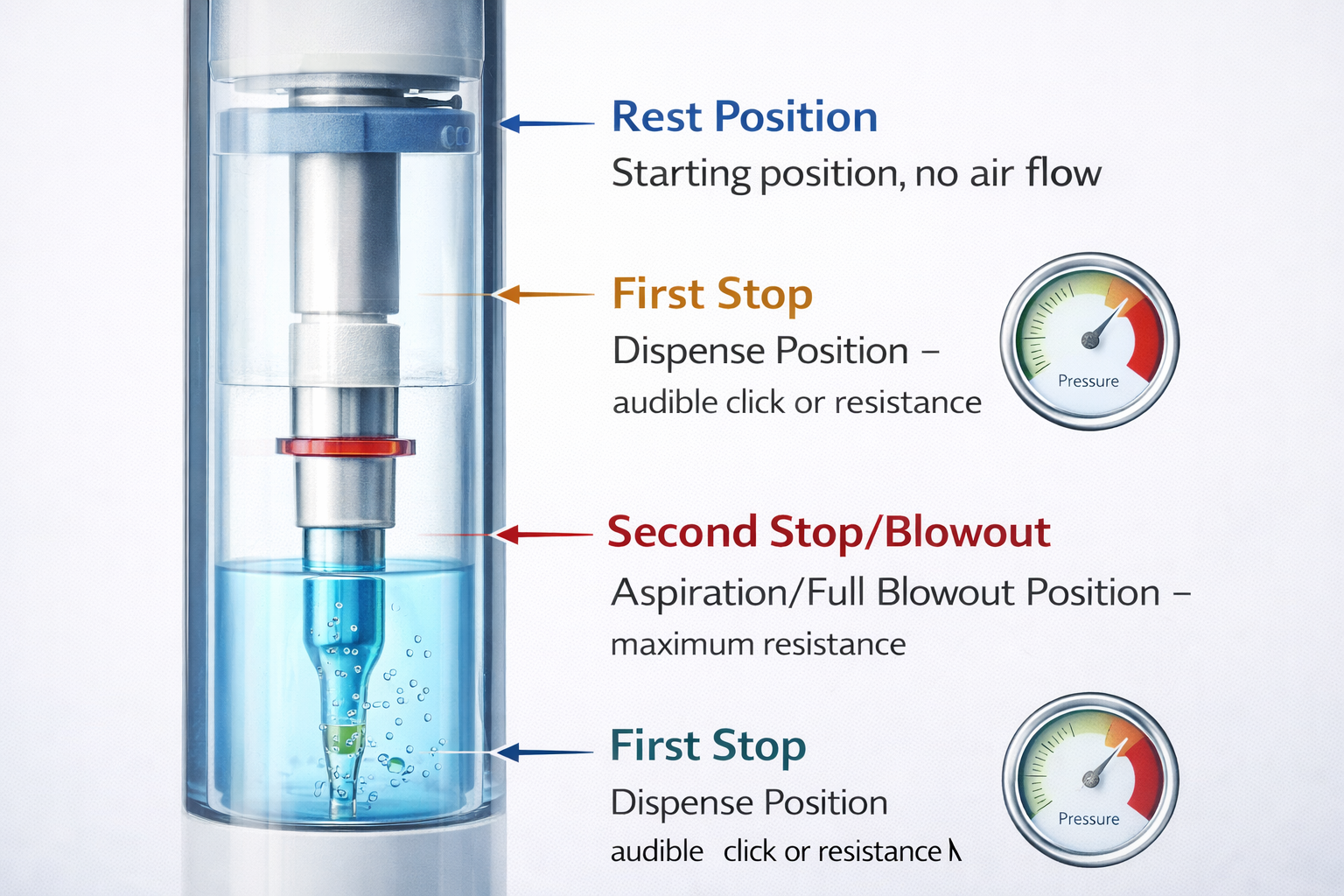 First Stop (Dispense Position): When pressed to the first stop, the plunger delivers the volume of air equal to the pipette’s set volume, pushing out the target amount of liquid. This is the normal position for forward pipetting aqueous solutions.