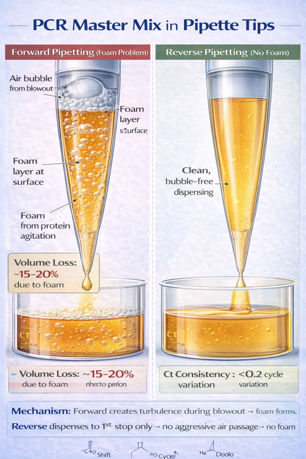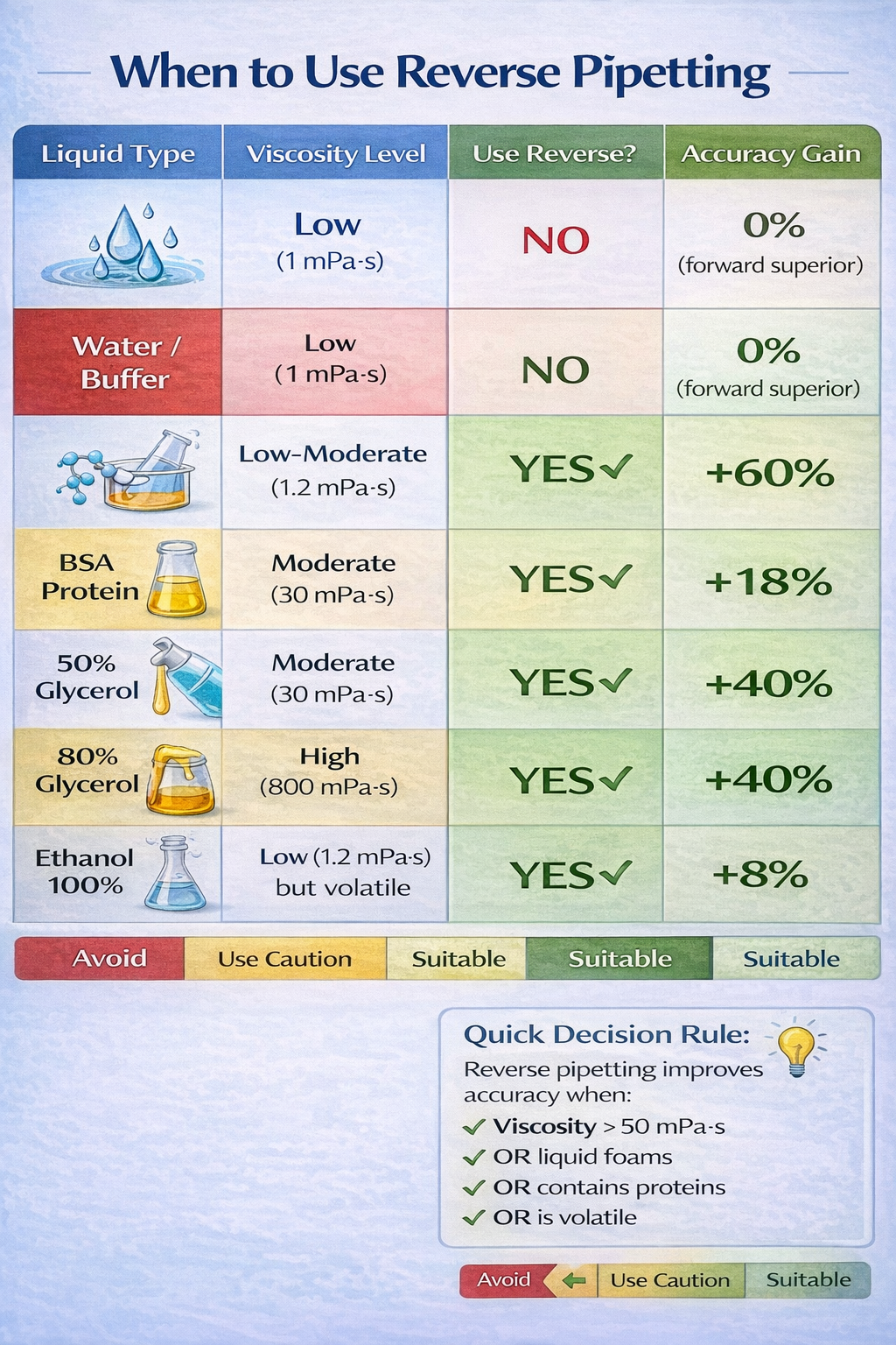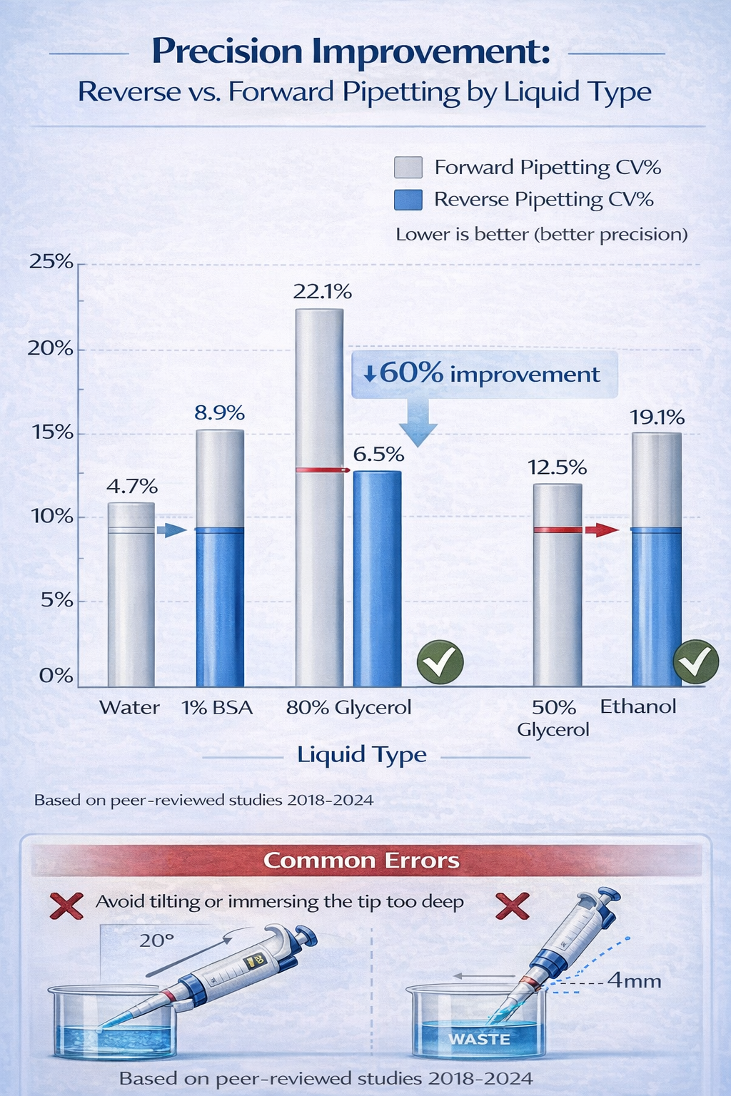 - Reverse pipetting improves precision by 40–60% for viscous, volatile, and protein-containing solutions compared to forward pipetting for the same liquids.