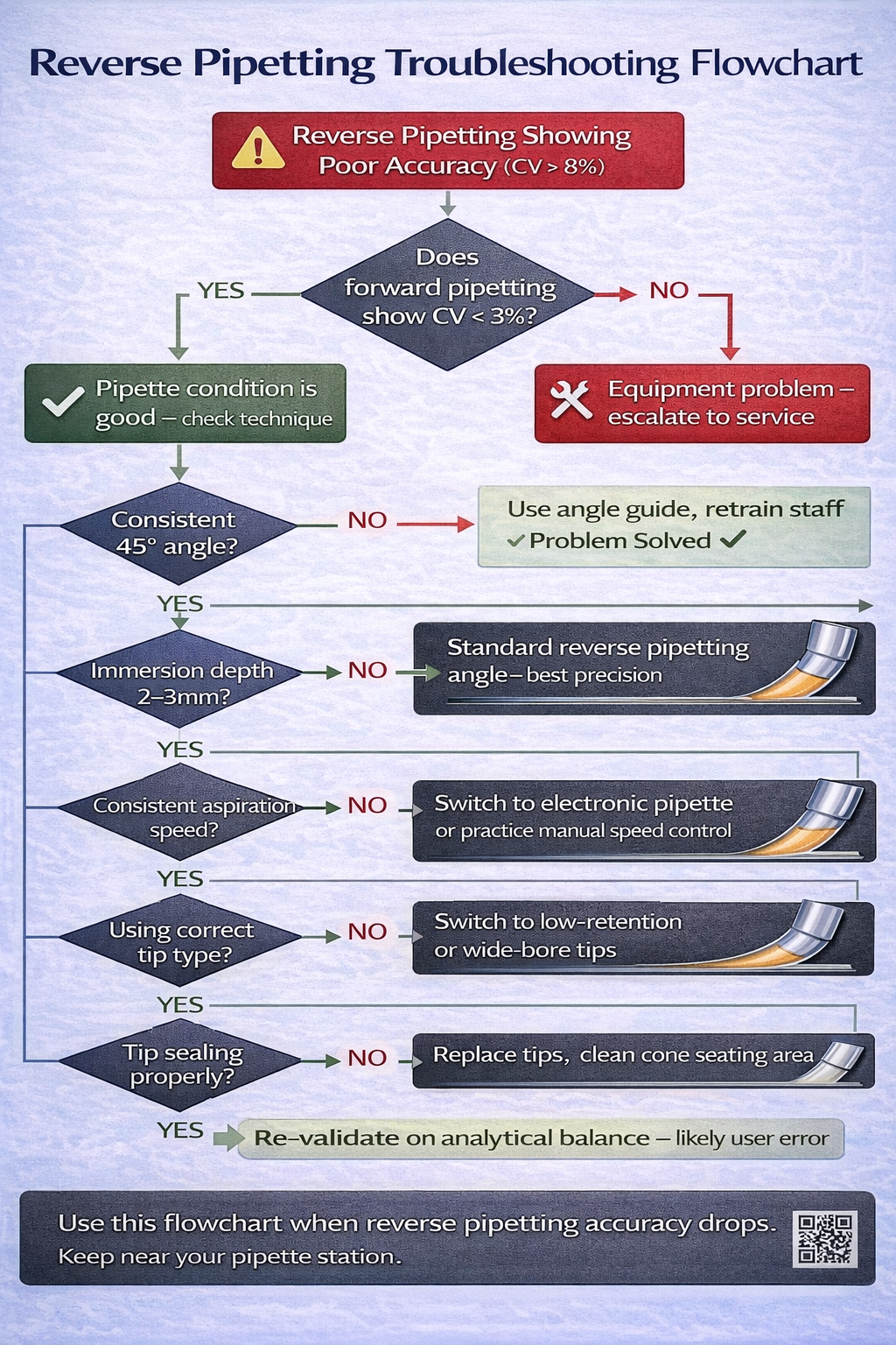 - For aqueous solutions, forward pipetting remains superior. Only apply reverse pipetting to its designed applications: viscous liquids (>50 mPa·s), volatile solvents, foaming solutions, and small-volume (<50 µL) precision work.
