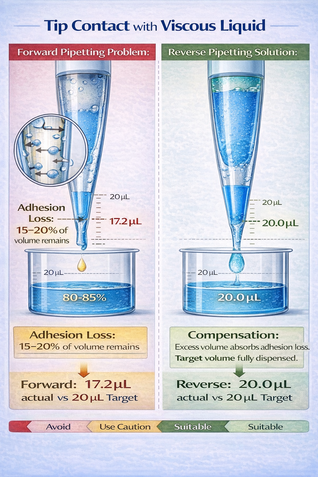 The technique addresses a fundamental physics problem: liquid adhesion to pipette tip walls. When aspirating aqueous solutions with standard forward pipetting, the liquid coats the interior surface of the plastic tip. During dispensing through air displacement, a portion of this liquid film remains attached to the tip material, reducing the actual volume delivered. For viscous, protein-containing, or volatile liquids, this effect intensifies dramatically.