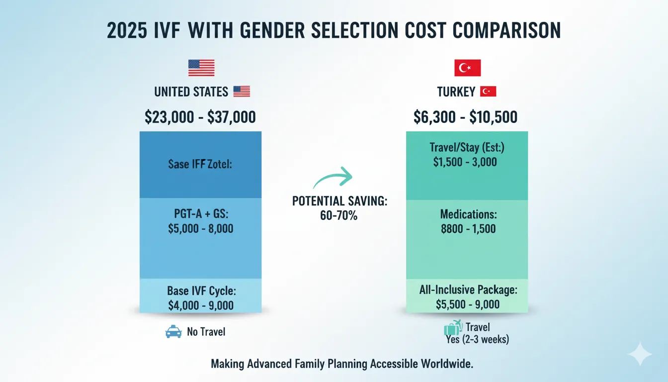 The cost savings in Turkey are dramatic. A complete IVF with gender selection package is often more affordable than just the PGT-A add-on in the USA. A typical cost breakdown is: