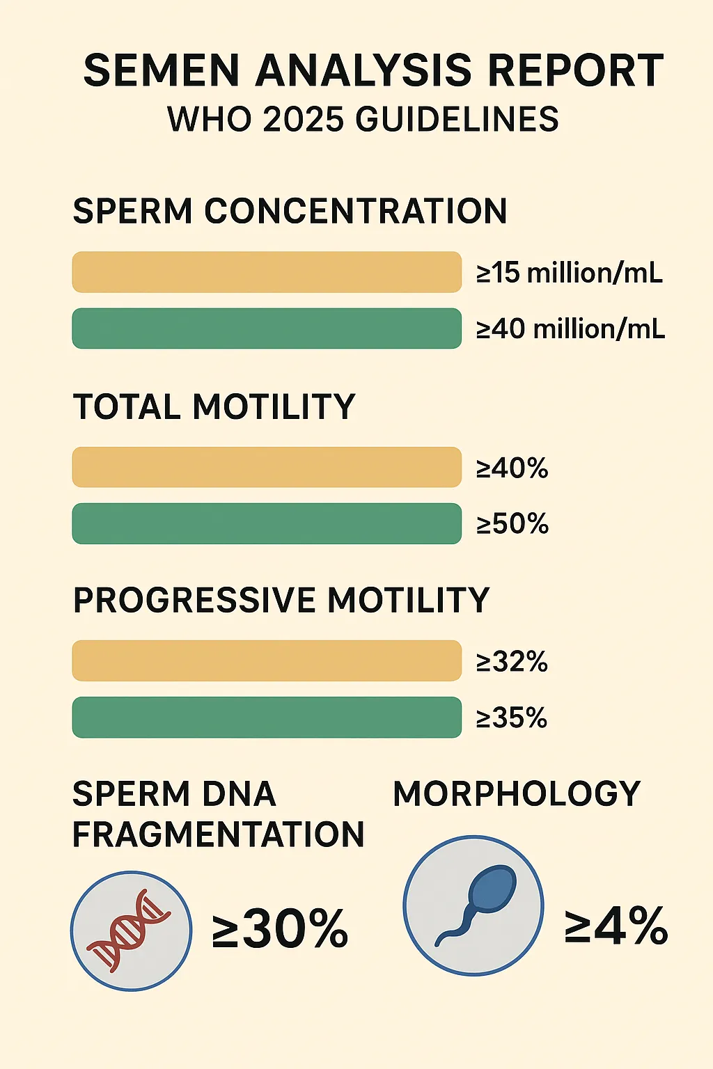 The WHO guidelines define the minimum threshold required for a man to be considered potentially fertile, but they do not define the ideal range for maximizing fertility. “Normal” means you meet the baseline; “optimal” means your parameters are in a range that significantly increases the probability of natural conception.